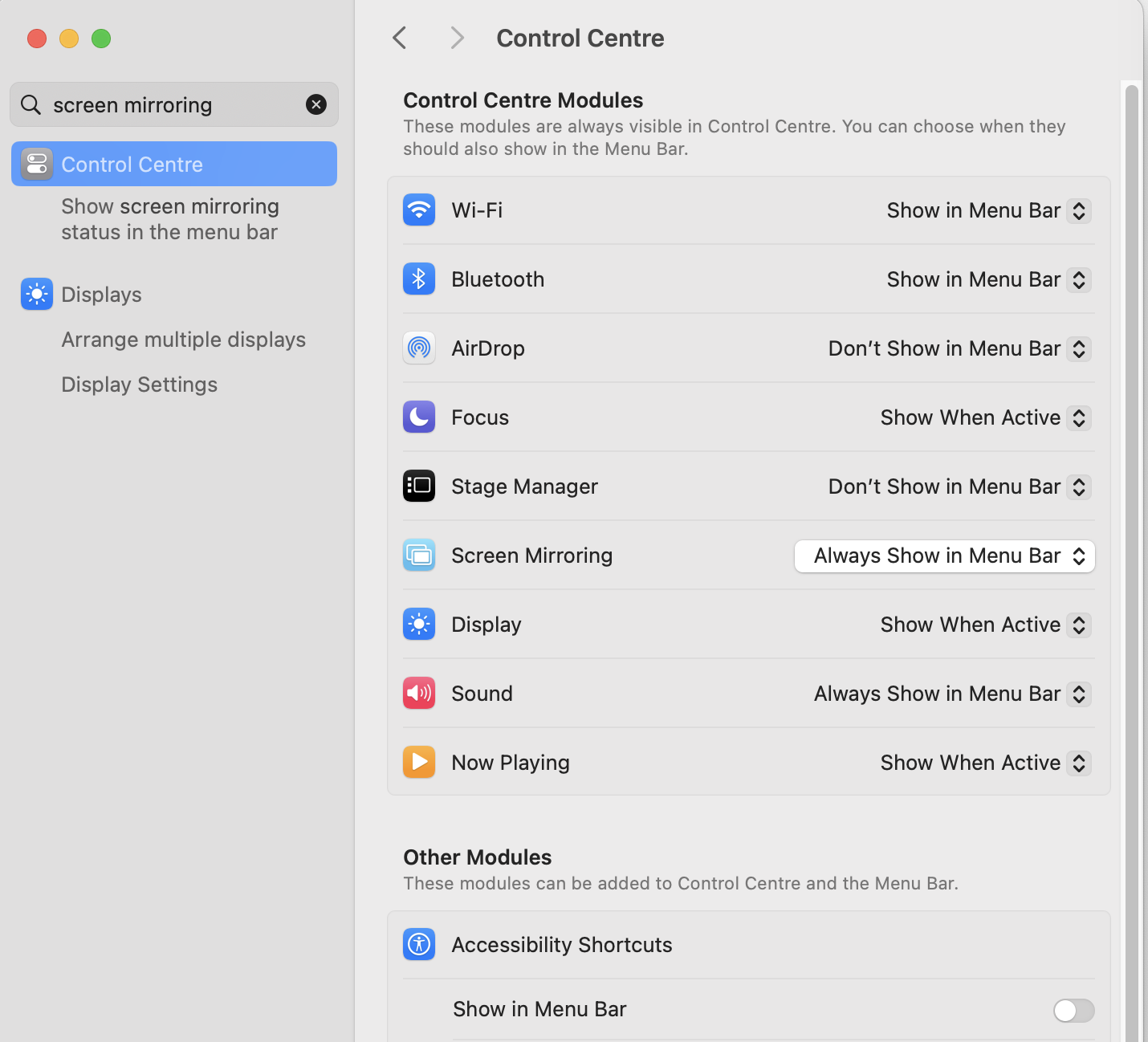 2. system settings > search "screen mirroring" > select "always show in menu bar"